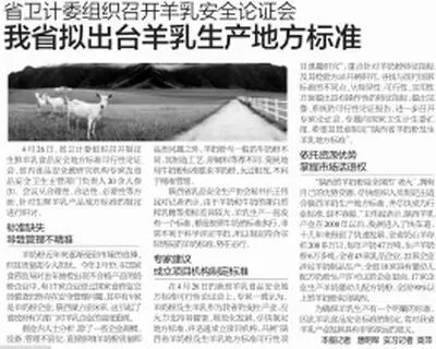地方标准缺失,在一定程度上影响着陕西羊乳产业的发展。制定陕西羊奶粉标准一直是业界和和很多关心陕西羊乳发展人士的期盼。羊乳已成为近年来陕西一项重要产业,省委省政府高度重视,并给予很大的支持。4月5日, 副省长主持召开专题座谈会,要求尽快制订羊奶粉地方标准。4月26日,省卫计委组织召开制定生鲜羊乳食品安全地方标准可行性论证会,进行研讨。